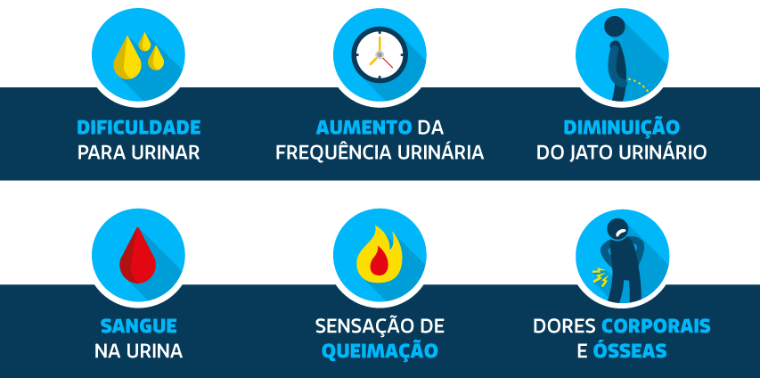 Na fase inicial, o câncer de próstata não apresenta sintomas e quando alguns sinais começam a aparecer, cerca de 95% dos tumores já estão em fase avançada, dificultando a cura. Na fase avançada, os sintomas são: