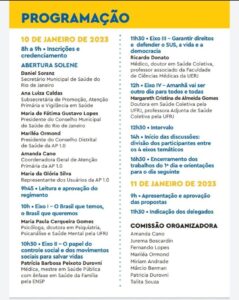 Nos dias 10 e 11 de janeiro de 2023, estará acontecendo a 14º Conferência Distrital de Saúde da AP 1.0, nas instalações da Universidade Estácio de Sá, no Centro do Rio. Com o tema, “Orgulho SUS: O Amanhã começa HOJE!”, o encontro vem para abordar diversos tópicos de extrema importância a saúde pública municipal. Entre os temas da programação estão o papel do controle social, a garantia de direitos, defesa do SUS, da vida e da democracia.