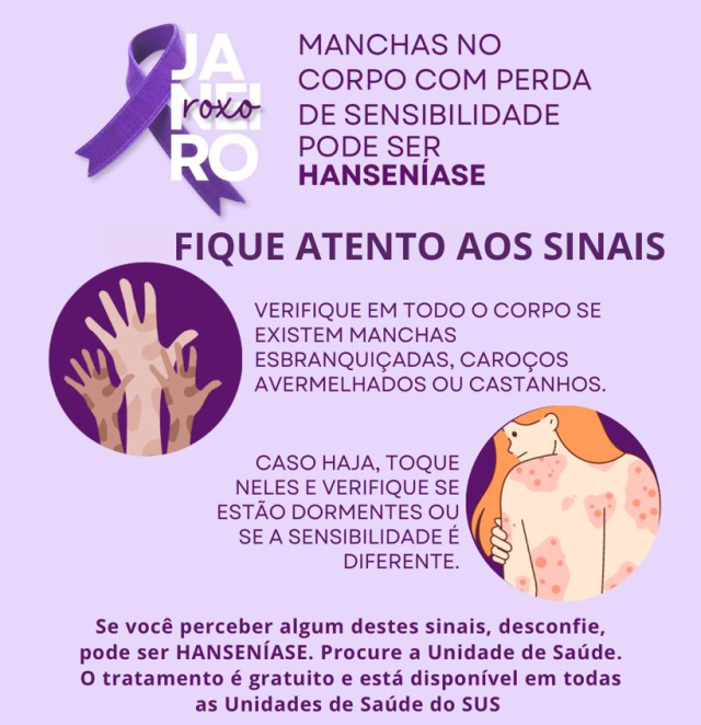 Durante o mês de Janeiro, além da conscientização sobre a saúde mental com a “Campanha Janeiro Branco”, neste mês também é celebrado o “Janeiro Roxo” para alertar e conscientizar a sociedade sobre o combate à Hanseníase. Desde 2016 o Ministério da Saúde oficializou o mês de janeiro e a cor roxa para campanhas educativas em todo o país.
