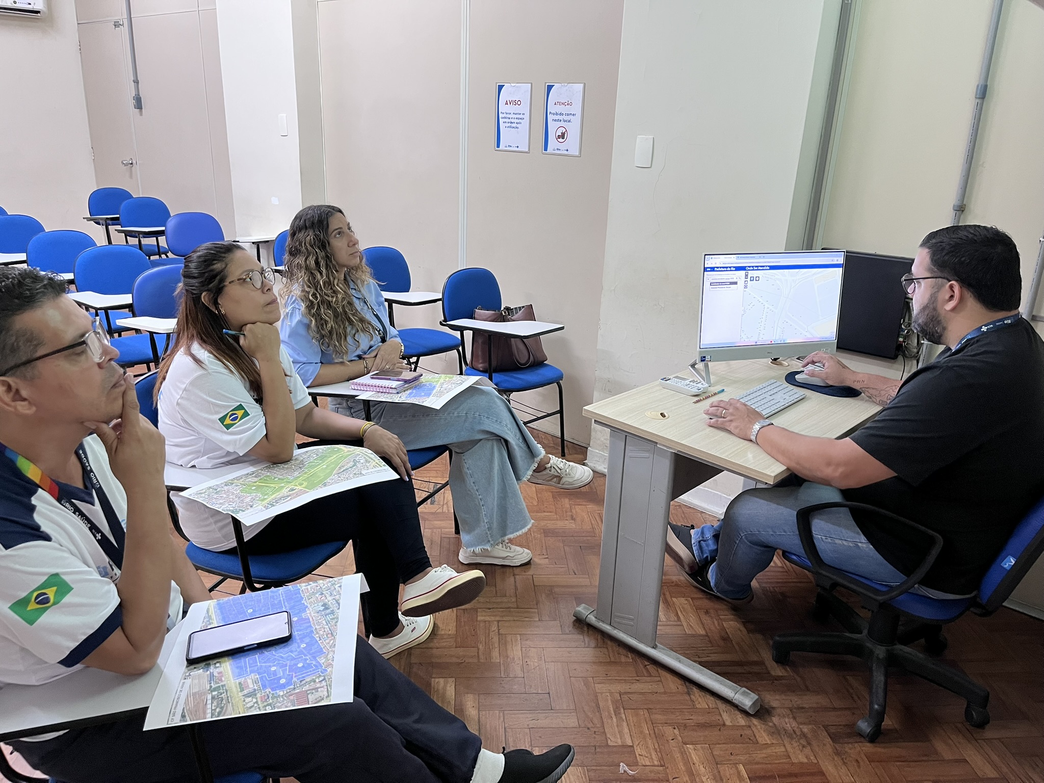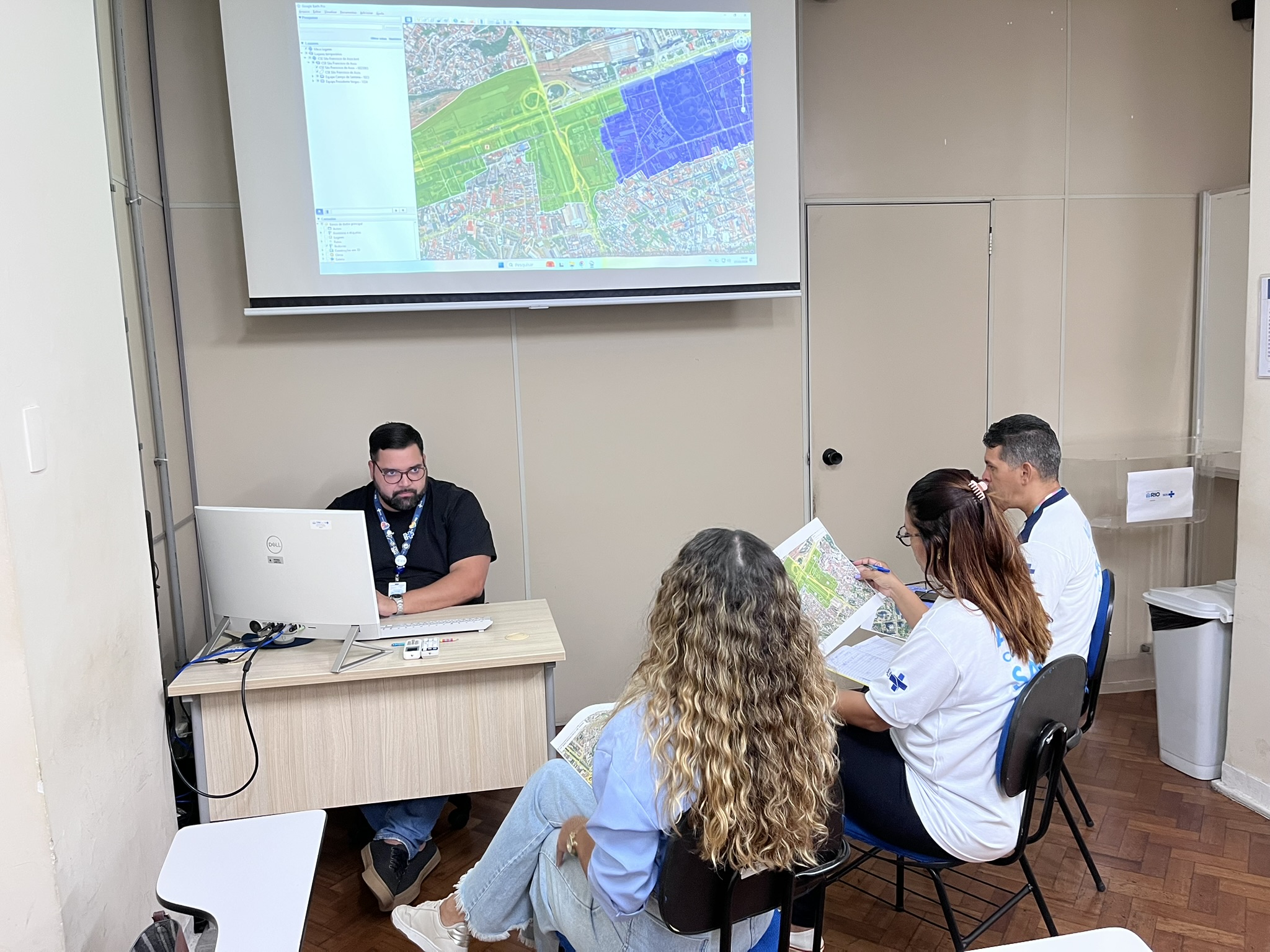 Durante a oficina, mediada por Vinícius Batista – Analista de Projetos OTICS-Rio Centro, foi utilizado o Google Earth Pro, ferramenta que permite a visualização do território em 3D e auxilia no desenho do mapa territorial da unidade.