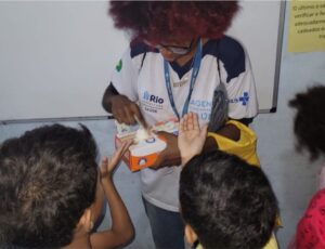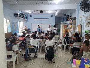 A Equipe Prazeres esteve na Escola Municipal Júlia Lopes de Almeida e realizou uma palestra sobre conscientização social e ambiental com os alunos, reforçando a importância do descarte correto de lixo no combate às doenças, e como pequenas ações melhoram a qualidade de vida no território.